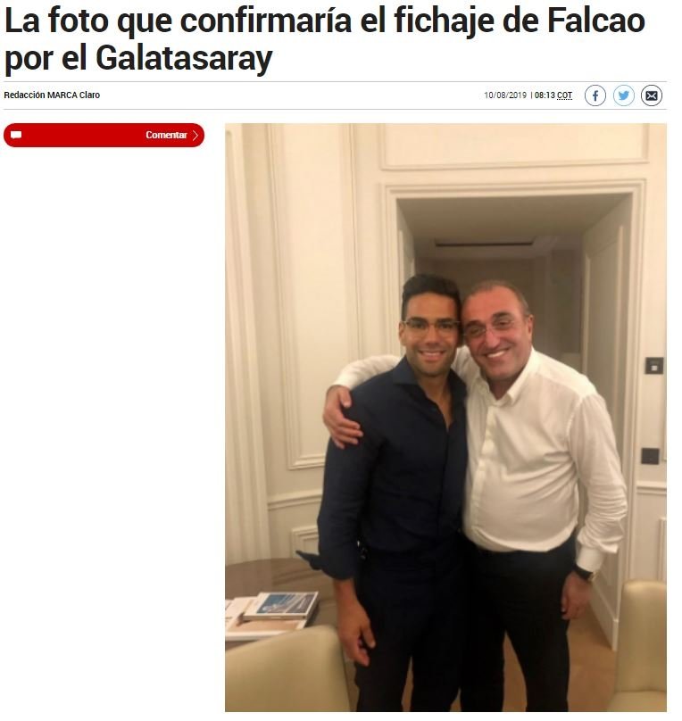 Sarı-kırmızılı taraftarı rahatlatan bir başka haber ise İspanyolların ünlü gazetesi Marca'nın Kolombiya edisyonunda yer aldı. Golcü oyuncunun, Abdurrahim Albayrak ile olan fotoğrafını paylaşan site, "Falcao'nun Galatasaray'a transferini doğrulayan fotoğraf" başlığıyla haberi okuyucularına duyurdu. Ayrıca haberin içerisinde Kolombiyalı yıldızın önümüzdeki hafta salı ya da çarşamba günü İstanbul'da olacağı bilgisi de paylaşıldı.
