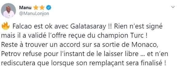 Bu arada Yahoo Sport France'ın muhabiri Manu Lonjon sosyal medya hesabından konuya ilişkin bir bilgilendirme yaptı. Falcao'nun Galatasaray'la anlaşma sağladığını söyleyen muhabir Lonjon, Monaco'da başkan yardımcısı Petrov'un henüz oyuncuyu bonservissiz göndermeye ikna olmadığını ve görüşmelerin sürdüğünü ifade etti. Öte yandan Fransız ekibinin, Kolombiyalı golcünün yerini doldurmak için Sevilla'dan Wissam Ben Yedder ile anlaşmaya yakın olduğunu da duyurdu.