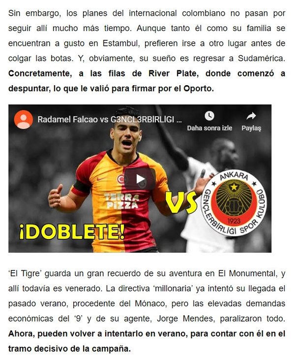 Haberde, Falcao'nun da kariyerindeki son takımın Galatasaray olmadığı ve yuvaya dönmeyi istemesinin bu transfer olasılığını güçlendirdiği belirtildi. Radamel Falcao'nun kendisi ve ailesinin İstanbul'da rahat olmasına rağmen kariyerine son vermeden başka bir takıma gitmek isteyen yıldız futbolcunun hayalinin Güney Amerika'ya dönmek olduğu bildirildi.