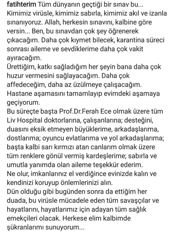 Galatasaray teknik direktörü Fatih Terim'in corona virüsü testi pozitif çıkmıştı ve bir süredir hastanede müşahade altında tutuluyordu. Deneyimli teknik adam kaldığı hastanaden taburdu oldu ve tedavisine evinden devam edeceği duyuruldu. Herkesin son durumunu merakla beklediği Fatih Terim'den sosyal medya hesabından bir açıklama geldi.