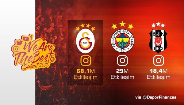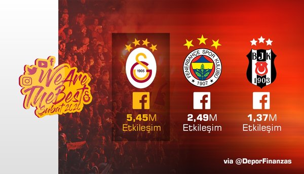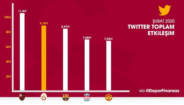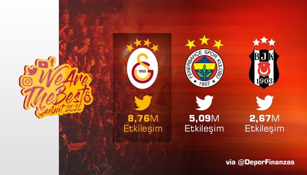 Sosyal medya etkileşim sayılarında Fenerbahçe ve Beşiktaş'ı geride bırakan Galatasaray, ''9 milyon 270 binden fazla takipçi sayısına ulaşan Twitter hesabımız, Şubat ayı verilerinde de Türkiye'deki rakiplerine bir kez daha fark attı. Twitter hesabımız, Şubat ayı boyunca Türkiye'deki her iki rakibinin toplamından daha fazla etkileşim aldı.'' notunu düştü.