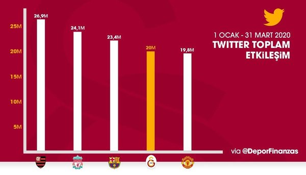 Süper Lig ekiplerinden Galatasaray sosyal medyayı en aktif olarak kullanan kulüpler arasında bulunuyor. Sarı-kırmızılı ekip yaptığı paylaşımlarla dünya genelinde en çok etkileşim alan kulüpler arasına girdi. 2020 yılının ilk çeyrek verilerine göre Galatasaray, sosyal medya platformu Twitter'da dünyada en çok etkileşim alan 4. kulüp oldu. Deportes&Finanzas'ın verilerine göre hazırlanan listede 1. sırada 26.9 milyon etkileşimle Brezilya'dan Flamengo ilk sırayı alırken, İngiltere'den Liverpool 24.1 milyon etkileşimle ikinci sırada yer aldı. İspanyol devi Barcelona 20 milyon etkileşimle 3. sırada kendine yer buldu. Galatasaray ise 19.8 milyon etkileşimle Avrupa'nın dev kulüplerini gerisinde bırakarak dünyada 2020'nin ilk çeyreğinde Twitter'da en çok etkileşim alan 4. takım oldu.