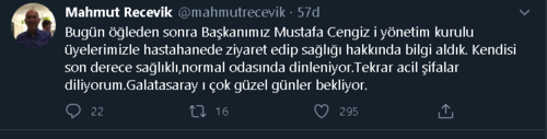 Ziyareti sonrasında Mustafa Cengiz'in sağlık durumu hakkında bir tweet atan Mahmut Recevik, "Bugün, öğleden sonra Başkanımız Mustafa Cengiz'i yönetim kurulu üyelerimizle hastahanede ziyaret edip, sağlığı hakkında bilgi aldık. Kendisi son derece sağlıklı, normal odasında dinleniyor. Tekrar acil şifalar diliyorum. Galatasaray'ı çok güzel günler bekliyor" ifadelerini kullandı.
