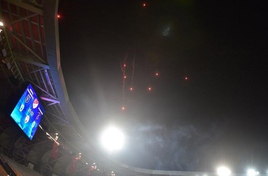 Karşılaşmanın 34'üncü dakikası oynanırken, stat dışından atılan havai fişeklerin bir parçasının da tribünlere düştüğü görüldü.