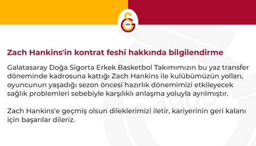 Yeni sezona hazırlanan Galatasaray Doğa Sigorta Basketbol Takımı'nda flaş bir gelişme yaşandı. Sarı-kırmızılılar, yeni transfer Zach Hankins ile zoraki olarak yollarını ayırdığını açıkladı.