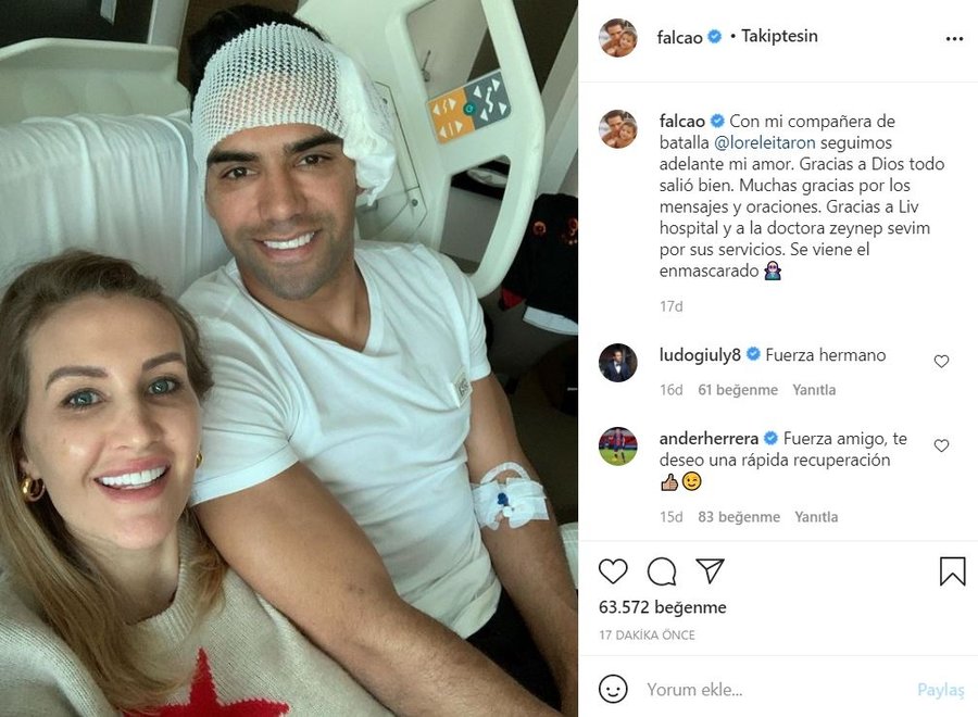 Galatasaray'da şanssız bir sakatlık geçirerek takım arkadaşı Kerem Aktürkoğlu ile kafa kafaya çarpışan Radamel Falcao'nun yüz kemiklerinde kırıklar meydana gelmişti. Operasyon geçiren Kolombiyalı yıldız, sosyal medya hesabı üzerinden bir paylaşım yaptı.