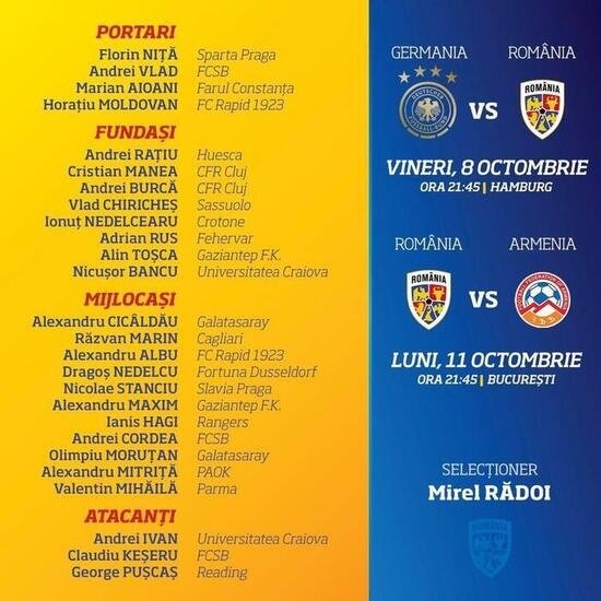 Galatasaray'ın yeni transferleri Cicaldau ve Morutan, Almanya ile deplasmanda yapılacak maç öncesi Romanya Milli Takımı'nın aday kadrosuna çağrıldı.