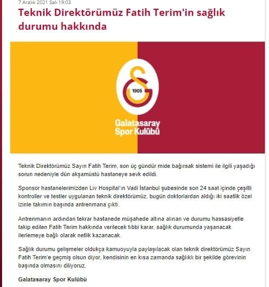 Sağlık durumu gelişmeler oldukça kamuoyuyla paylaşılacak olan teknik direktörümüz Sayın Fatih Terim'e geçmiş olsun diyor, kendisinin en kısa zamanda sağlıklı bir şekilde görevinin başında olmasını diliyoruz."