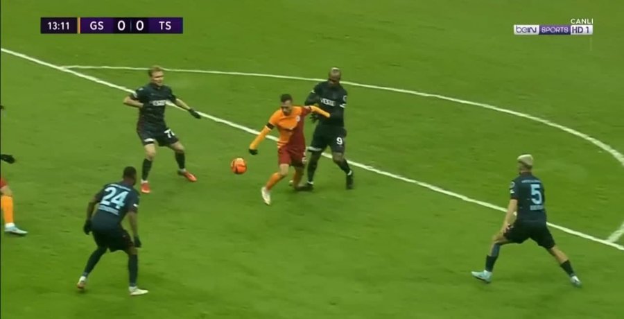 Galatasaraylı futbolcular bu pozisyonda penaltı bekledi fakat Atilla Karaoğlan oyunu devam ettirdi.