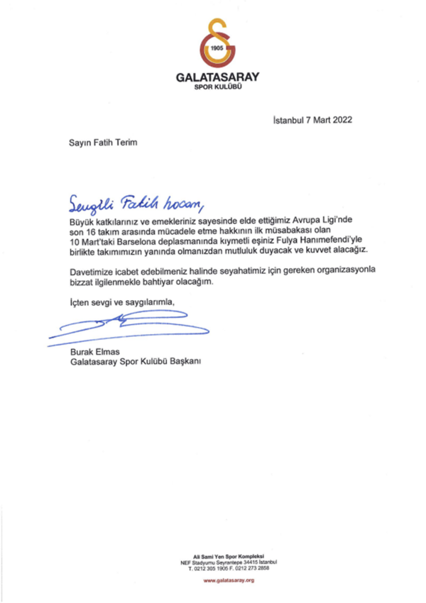 NTV Spor'un haberine göre; Galatasaray Başkanı Burak Elmas, Fatih Terim ve eşi Fulya Terim'i gönderdiği mektup ile perşembe günü Camp Nou'da oynanacak Barcelona-Galatasaray maçına davet etti.