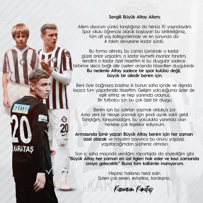 Futbola Altay'ımızda başlayan, Altay Spor Okulları'nda yetişen, ardından altyapımızda her yaş grubundaki takımlarımızda forma giyen, U17- U19 ve U21 Milli Takımı'mızın oyuncusu olan evladımız Kazımcan Karataş'a kulübümüze verdiği tüm hizmetler için çok teşekkür ederiz.