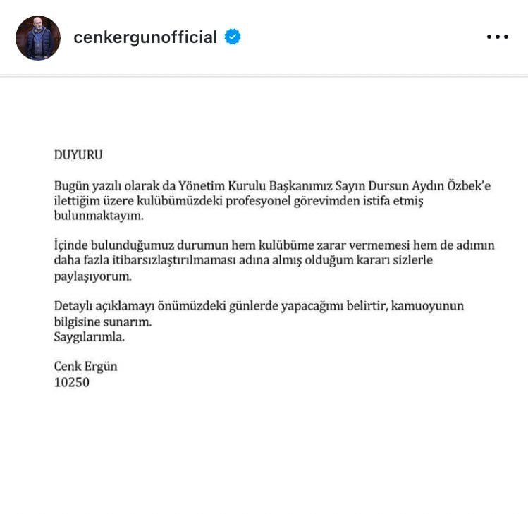 Ergün, açıklamasında "Bugün yazılı olarak da Yönetim Kurulu Başkanımız Sayın Dursun Aydın Özbek'e ilettiğim üzere kulübümüzdeki profesyonel görevimden istifa etmiş bulunmaktayım. İçinde bulunduğumuz durumun hem kulübüme zarar vermemesi hem de adımın daha fazla itibarsızlaştırılmaması adına almış olduğum kararı sizlerle paylaşıyorum. Detaylı açıklamayı önümüzdeki günlerde yapacağımı belirtir, kamuoyunun bilgisine sunarım." dedi.