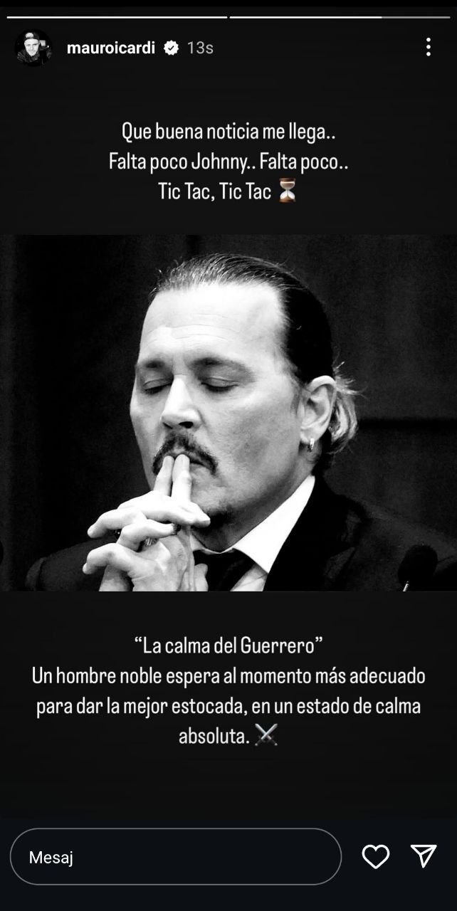 Galatasaray'ın yıldız futbolcusu Mauro Icardi, çarpraz bağ sakatlığı yaşamasının ardından ameliyat olmuş ve tedavisini Arjantin'de geçirirken, yeni sevgilisi China Suarez ile sosyal medyada fotoğraflar paylaşmıştı. Wanda Nara ile davası devam eden Icardi, sosyal medya hesabından bir Johnny Depp gönderisi daha paylaştı. 31 yaşındaki futbolcu yaptığı paylaşıma, "Ne güzel haberler geliyor.. Az kaldı Johnny.. Az kaldı.. Tik Tak, Tik Tak. 'Savaşçının Sakinliği' Soylu bir adam, en iyi darbeyi vurmak için en uygun anı bekler, mutlak bir sakinlik durumunda." notunu düştü.