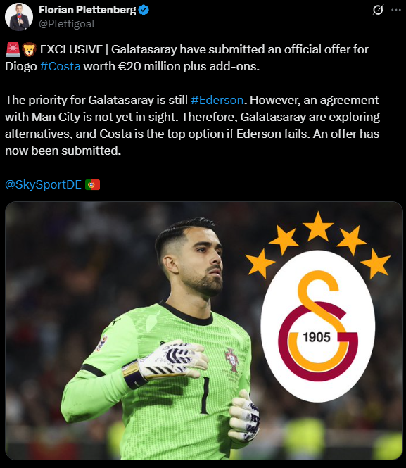 Sky Deutschland muhabiri Florian Plettenberg'in aktardığı habere göre Galatasaray, Porto'nun kalecisi Diogo Costa için 20 milyon Euro bonservis bedeli ve bonuslar içeren resmi bir teklif sundu. Haberde, Ederson transferinin gerçekleşmemesi durumunda sarı-kırmızılıların ilk tercihinin Diogo Costa olacağı ifade edildi.