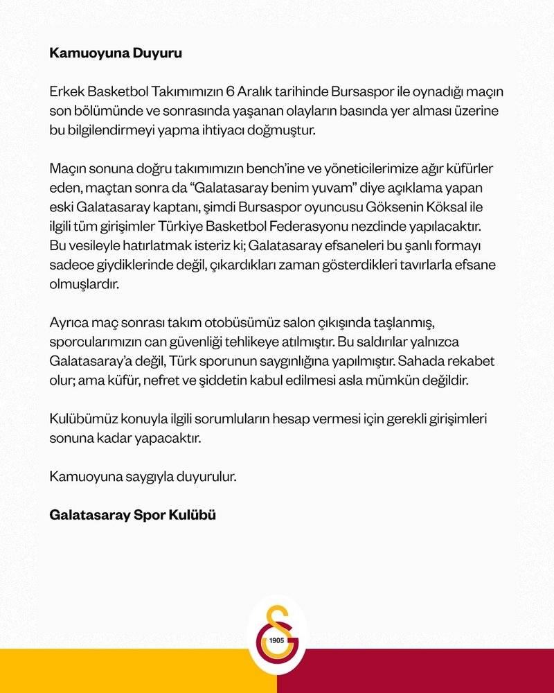 "Erkek Basketbol Takımımızın 6 Aralık tarihinde Bursaspor ile oynadığı maçın son bölümünde ve sonrasında yaşanan olayların basında yer alması üzerine bu bilgilendirmeyi yapma ihtiyacı doğmuştur. Maçın sonuna doğru takımımızın benchine ve yöneticilerimize ağır küfürler eden, maçtan sonra da 'Galatasaray benim yuvam' diye açıklama yapan eski Galatasaray kaptanı, şimdi Bursaspor oyuncusu Göksenin Köksal ile ilgili tüm girişimler Türkiye Basketbol Federasyonu nezdinde yapılacaktır. Bu vesileyle hatırlatmak isteriz ki; Galatasaray efsaneleri bu şanlı formayı sadece giydiklerinde değil, çıkardıkları zaman gösterdikleri tavırlarla efsane olmuşlardır. Ayrıca maç sonrası takım otobüsümüz salon çıkışında taşlanmış, sporcularımızın can güvenliği tehlikeye atılmıştır. Bu saldırılar yalnızca Galatasaray'a değil, Türk sporunun saygınlığına yapılmıştır. Sahada rekabet olur; ama küfür, nefret ve şiddetin kabul edilmesi asla mümkün değildir. Kulübümüz konuyla ilgili sorumluların hesap vermesi için gerekli girişimleri sonuna kadar yapacaktır."