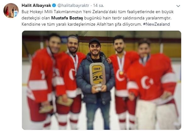 Türkiye Buz Hokeyi Federasyonu Başkanı Halit Albayrak Yeni Zelanda'daki terör saldırısında yaralanan Türkiye vatandaşı Mustafa Boztaş hakkında yaptığı paylaşımda, "En büyük destekçilerimizden Mustafa Boztaş'a ve tüm yaralılarımıza şifa diliyorum." dedi.
