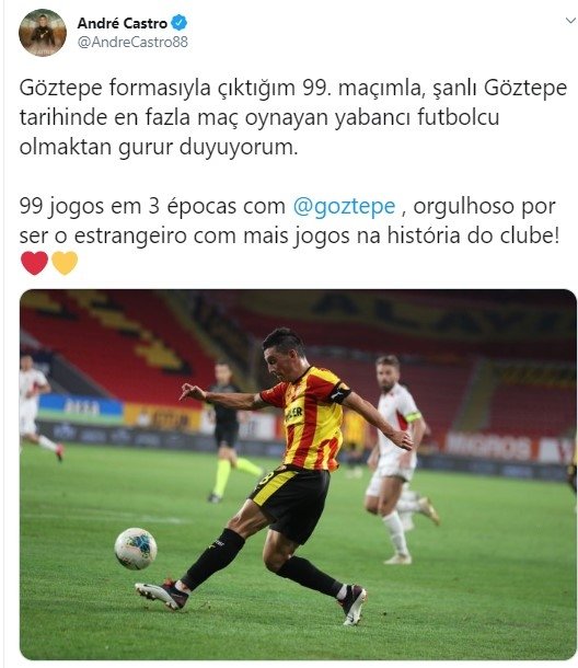 Castro, konu ile ilgili yaptığı sosyal medya paylaşımında, "Göztepe formasıyla çıktığım 99. maçımla, şanlı Göztepe tarihinde en fazla maç oynayan yabancı futbolcu olmaktan gurur duyuyorum." dedi.