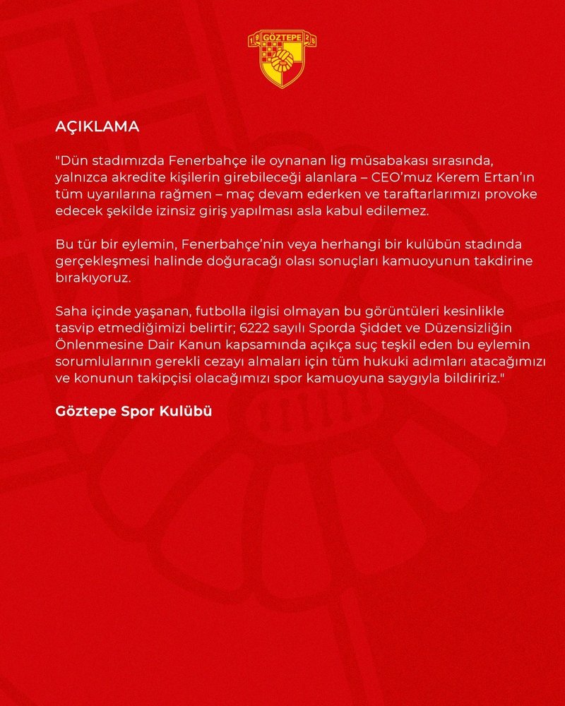Sarı-kırmızılı kulüpten yapılan açıklamada, dün Gürsel Aksel Stadı'nda oynadıkları Fenerbahçe karşılaşmasında kulüp CEO'su Kerem Ertan'ın uyarılarına rağmen yalnızca akredite kişilerin girebileceği alanlara taraftarları kışkırtıcı şekilde izinsiz giriş yapıldığı ve bunun kabul edilemeyeceği belirtildi.