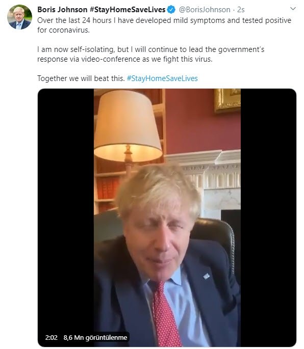 İngiltere'de büyük bir şok yaşanıyor. Tüm dünyayı etkisi altına alan corona virüsü salgını İngiltere Başbakanı Boris Johnson'da da pozitif çıktı. Boris Johnson kötü haberi sosyal medya hesabından duyurdu.