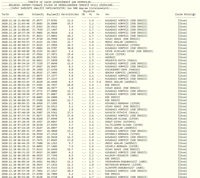 10 KASIM AFAD SON DEPREMLER LİSTESİ