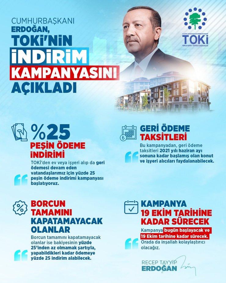 Başkan Recep Tayyip Erdoğan, yüzde 25 peşin ödeme indirimi başladığını açıkladı. Toki'den ev veya işyeri alıp da geri ödemesi devam eden vatandaşlarımız için yüzde 25 peşin ödeme indirimi kanpanyası başlatıldı. Tamamını kapatamayacaklar borcun yüzde 25'inden az olmamak şartıyla, yapabildikleri kadar ödemeye yüzde 25 indirim alabilecek
