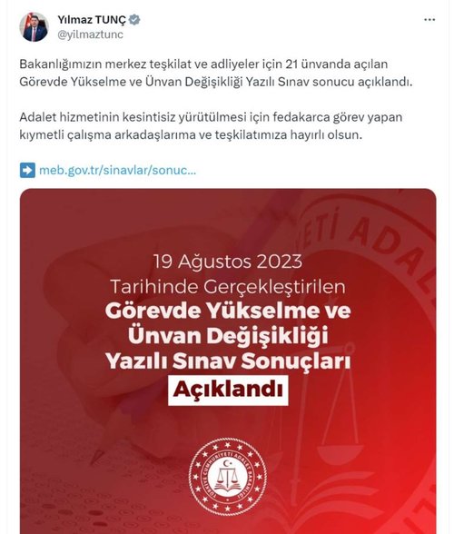 Adalet Bakanı Yılmaz Tunç, sosyal medya hesabından yaptığı açıklamada, "Bakanlığımızın merkez teşkilat ve adliyeler için 21 unvanda açılan Görevde Yükselme ve Unvan Değişikliği Yazılı Sınav sonucu açıklandı. Adalet hizmetinin kesintisiz yürütülmesi için fedakarca görev yapan kıymetli çalışma arkadaşlarıma ve teşkilatımıza hayırlı olsun" dedi.