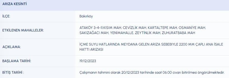 20 ARALIK 2023 BAKIRKÖY SU KESİNTİSİ | İstanbul Su ve Kanalizasyon İdaresi'nce yürütülen çalışmalar kapsamında, Bakırköy'de bazı mahallelerinde planlı olarak su kesintileri yapılacağı duyuruldu. Arıza kaynaklı yapılan çalışmalarda İSKİ, internet sitesinde suların gideceği mahalleleri tek tek bildirip vatandaşları uyarırken evde su olmadığını gören kişiler ise arama motorlarında 22 Kasım 2023 sular ne zaman gelecek? sorusunun cevabını araştırıyor. İşte İSKİ İstanbul Bakırköy 20 Aralık Çarşamba günü planlı su kesintisi yaşanacak mahalleler...