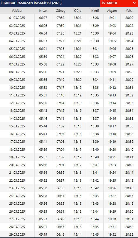 İSTANBUL İFTAR VE SAHUR VAKİTLERİ 3 MART 2025