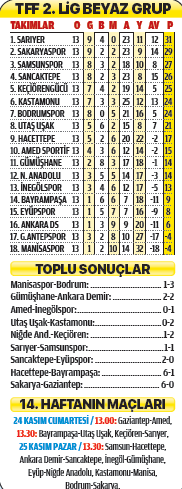 TFF 2. Lig Beyaz Grup'ta Sakarya fırtınası hız kesmeden sürüyor. İsmail Ertekin'in göreve gelmesi ile rakip tanımayan yeşil-siyahlıların son kurbanı Gaziantep oldu. Seyircisinin desteğini arkasına alan Tatangalar, İlyas Çakmak'ın 3 golle yıldızlaştığı karşılaşmada Dilaver, Yasin ve İsmail'le farka koştu. 6-0'lık galibiyetle son 9. maçındaki 8. zaferini aldı. Sarıyer'in, Samsun'a takılmasıyla zirveyle fark da ikiye düştü.