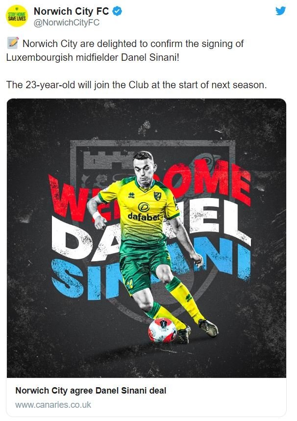 Premier Lig'in corona virüsü salgını nedeniyle askıya alınmasını fırsat bilen Norwich City, kadrosunu güçlendirdi. Kulüp, Dudelange'da forma giyen Lüksemburglu 23 yaşındaki forvet oyuncusu Danel Sinani'yi renklerine bağladığını duyurdu.