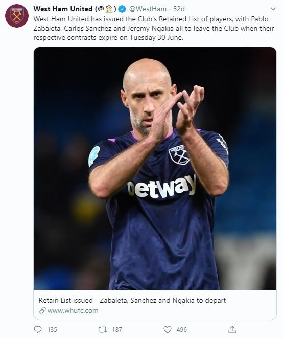 Bazı kulüpler, corona virüsü nedeniyle liglere ara verilmesi sonrası sözleşmesi ay sonunda bitecek olan futbolcularının kontratlarını bir süreliğine uzatıyordu ancak West Ham yönetiminden ayrılık kararı çıktı.