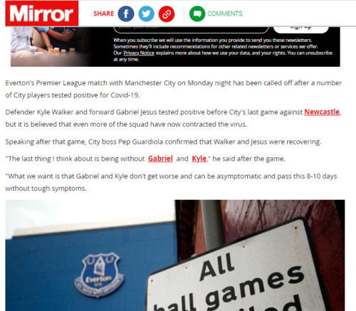 İngiltere'nin önde gelen basın organlarından Mirror'un son dakika olarak geçtiği haberde Manchester City'nin Newcastle'a karşı oynadığı mücadele öncesi Kyle Walker ve Gabriel Jesus'un test sonuçlarının pozitif çıkmasının ardından bu karşılaşma öncesinde de birçok oyuncunun test sonucunun pozitif olduğu bilgisini paylaşarak karşılaşmanın iptal edildiğini duyurdu.