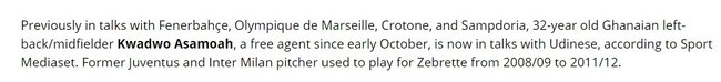 Asamoah'ın bir süredir Serie A ekibinin yetkilileri ile görüştüğü ve resmi imzayı atmaya sıcak olduğu kaydedildi.