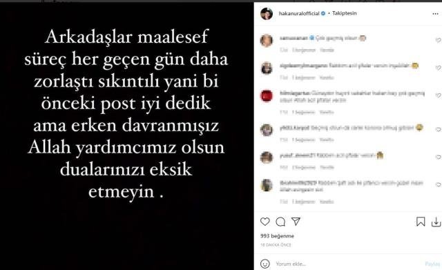 Hakan Ural'ın son durumuna ilişkin açıklama yapan partneri Nur Tuğba Namlı "Hakan en kısa sürede burada olacak. Aklınızın takılacağı hiçbir şey yok. Hakan'a malesef Covid-19 tanısı konuldu ama sağlığı çok iyi. Yaptırdığı bütün testler negatif çıktı" demişti.