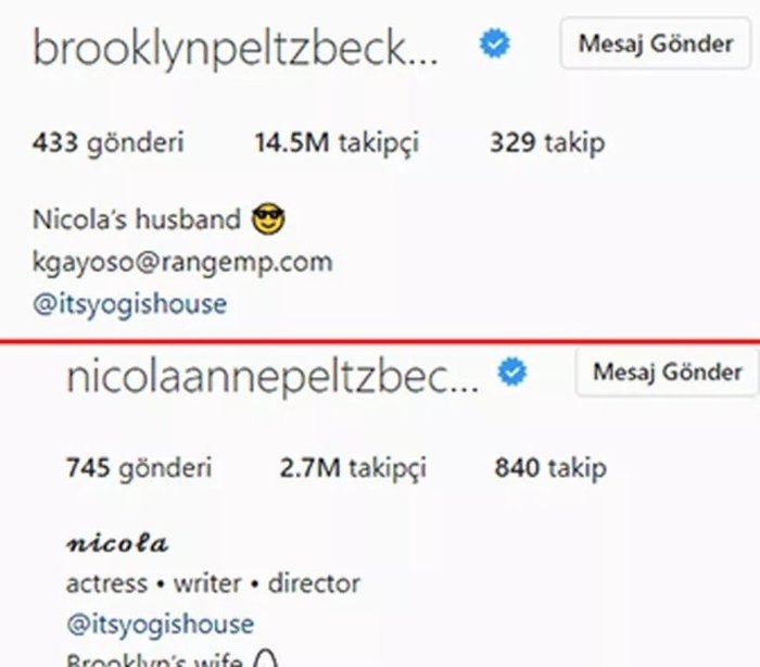 Instagram sayfasında 14.5 milyon takipçisi bulunan 23 yaşındaki Brooklyn Beckham profiline ''Nicola'nın kocası" yazısını ekledi. 27 yaşındaki Nicola ise jesti yanıtsız bırakmadı ve 2.7 milyon takipçisi olan Instagram sayfasına "Brooklyn'in karısı" diye yazdı.