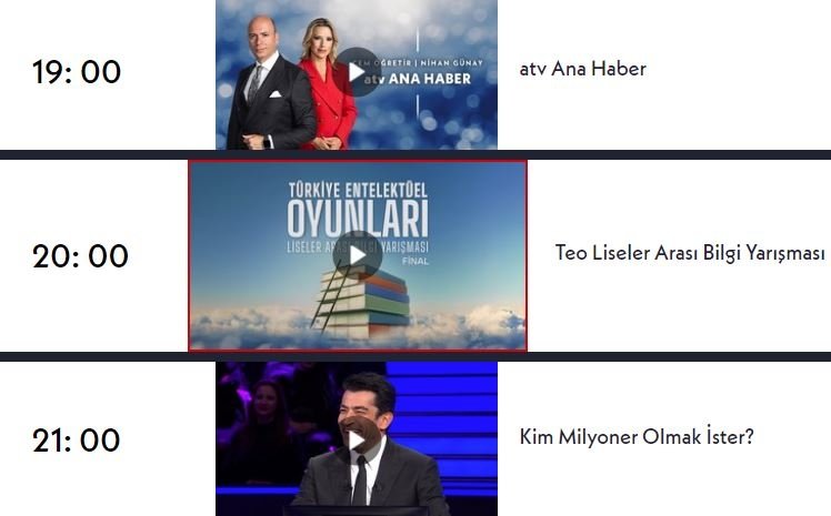 Kim Milyoner Olmak İster 26 Mayıs 2024 tarihli yeni bölümü saat 21.00'de ekranlara gelecek. Yarışma programının öncesinde ise saat 20.00'de Teo Liseler Arası Bilgi Yarışması yayınlanıyor.