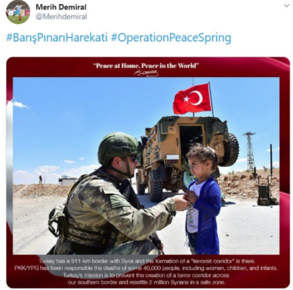 Merih Demiral, ellerinde Türk bayrağı bulunan çocukların Türk askerini sevinçle karşılaması ve askerlerin çocuklara karşı şefkatli yaklaşımlarının olduğu fotoğraflara da yer verdi.