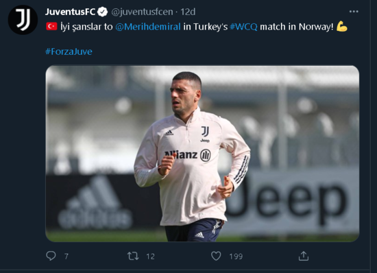 İtalya Serte A ekibi Juventus, A Milli Futbol Takımı'mızın, 2022 Dünya Kupası Elemeleri'nde oynayacağı Norveç maçı öncesi flaş bir paylaşımda bulundu. Siyah-beyazlıların resmi sosyal medya hesabından yapılan paylaşımda Merih Demiral'ın fotoğrafına yer verilip, Türkçe olarak, "İyi şanslar Merih Demiral" ifadeleri kullanıldı.