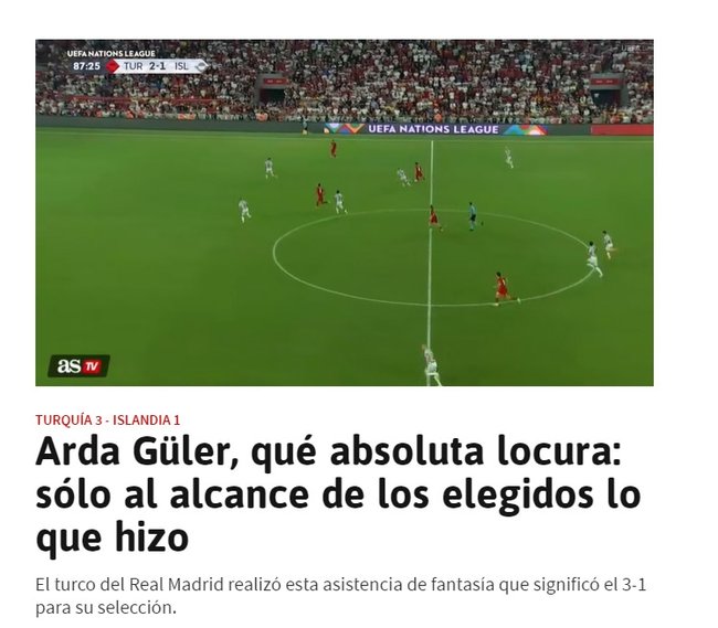 İspanyol basınından AS, Arda'nın verdiği son gol pasını manşetlerine taşıdı. AS; Arda'nın enfes asistini paylaşırken, 'Bu ne çılgınlık!' başlığını attı. AS ayrıca Arda'nın asistiyle ilgili olarak 'Fantastik' yorumunu da yaptı.
