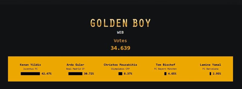 İtalyan gazetesi TuttoSport'un yaptığı Golden Boy Web Ödülü'nün 3. Tur sonuçlarında son durum belli oldu. Oylamaya göre, Juventus forması giyen Kenan Yıldız, %42.47 oyla birinci sırada yer alırken Real Madrid'li oyuncu Arda Güler, %30.72 ile ikinci sırada yer aldı.