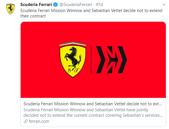 Ferrari'den yapılan açıklamaya göre, 32 yaşındaki sürücü ile 2015'ten itibaren yarıştığı ve 14 birincilik elde ettiği takım arasındaki görüşmeler olumsuz sonuçlandı.