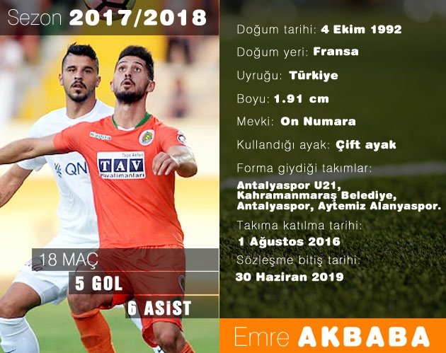 Antalyaspor'dan 3. Lig'de mücadele eden Kahramanmaraş Büyükşehir Belediyespor'a giden oradan tekrar Antalyaspor'a geldikten sonra Aytemiz Alanyaspor'a transfer olan Emre Akbaba'nın adı şu sıralar Süper Lig'in köklü kulüpleriyle anılıyor. Aytemiz Alanyaspor'da gösterdiği performansla A Milli Takım'a kadar yükselen ve 'On Numara' mevkinde oynayan Akbaba da yolu Avrupa'ya düşebilecek aday oyunculardan biri durumunda. 2016-2017 sezonunda 34 maçta forma giyen 25 yaşındaki oyuncu 6 gol atıp, 6 asit yaparken, 2017-2018 sezonunda ise forma giydiği 18 maçta 5 gol atıp 6 asist yapma başarısı gösterdi.