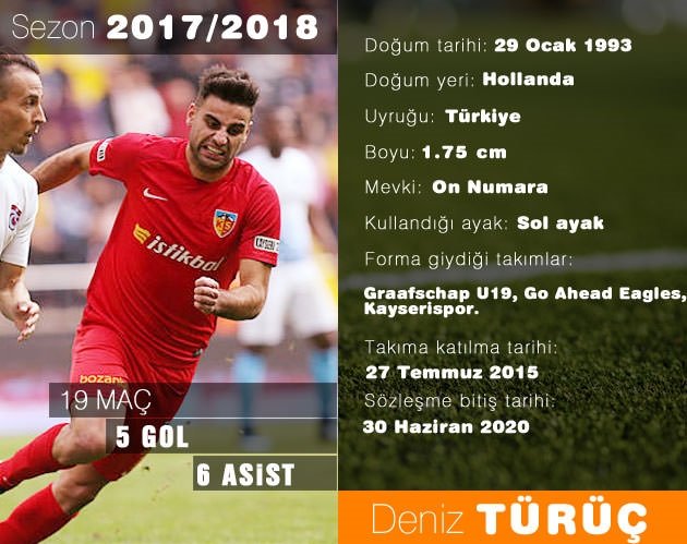 Bu sezon Süper Lig'in flaş takımlarından Kayserispor'un yıldız isimlerinden biri olan Deniz Türüç de Emre Akbaba gibi transfer gündemini meşgul eden isimler arasında yer alıyor. Sarı-kırmızılı takımda gösterdiği performansla A Milli Takım formasını da giymeyi başaran başarılı 'On Numara', Kayserispor'a Hollanda ekibi Go Ahead Eagles'tan transfer olmuştu. 24 yaşındaki oyuncu 2015-2016 sezonunda 42 maçta 6 gol 1 asist, 2016-2017 sezonunda 38 maçta 11 gol 11 asist, 2017-2018 sezonunda 19 maçta 5 gol 6 asistlik bir performans sergilemiş durumda.