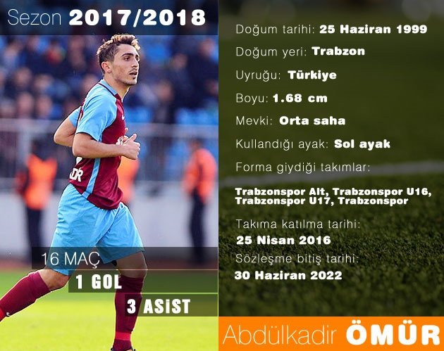 Türk futbolunun yükselen genç yıldızlarından biri daha: Abdülkadir Ömür! Yine Trabzonspor'un altyapsında yetişen bir diğer isim olan Abdülkadir Ömür, 2016 yılından beri bordo-mavili ekibin A takımında forma giyiyor. 18 yaşında olan ve orta sahada görev yapan Ömür için de İtalyan ekipleri Milan ve Roma'nın adı geçerken, Bayern Münih'in de bordo-mavili oyuncuyu istediği gelen bilgiler arasında. 2016-2017 sezonunda 5 kez Trabzonspor forması giyen Abdülkadir, 1 gol atarken, 2017-2018 sezonunda ise 16 maçta 1 gol ve 3 asistlik bir performans sergiledi.