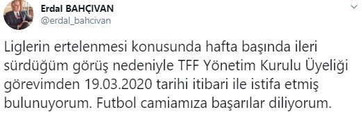 TFF Başkan Vekili ve İcra Kurulu üyesi Erdal Bahçıvan, TFF Başkanı Nihat Özdemir'in talebiyle federasyondaki tüm görevlerinden istifa etti.