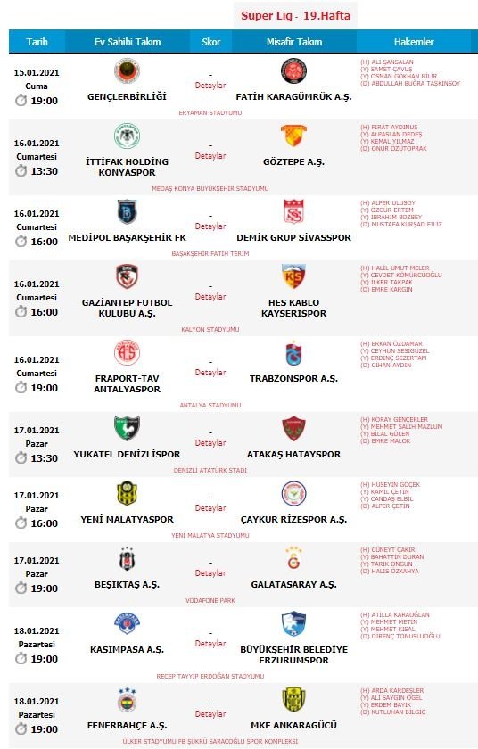 Süper Lig'de 19. hafta maçlarını yönetecek hakemler belli oldu. Türkiye Futbol Federasyonu Merkez Hakem Kurulundan yapılan açıklamaya göre, ligde haftanın maçlarını yönetecek hakemler şunlar: