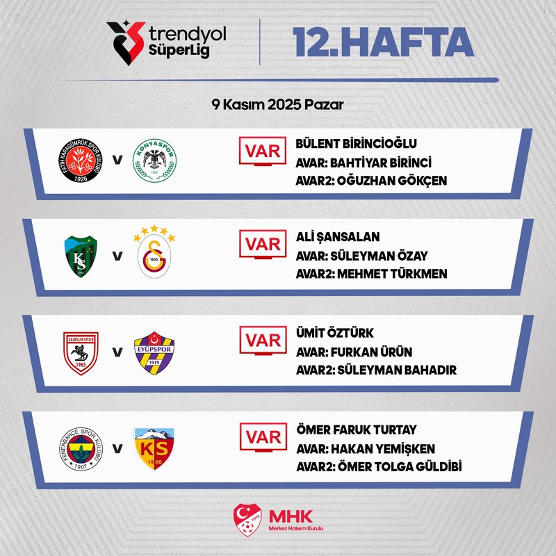 Trendyol Süper Lig'in 12. haftasında 9 Kasım 2025 Pazar günü oynanacak karşılaşmaların VAR hakemleri açıklandı. Merkez Hakem Kurulu (MHK) tarafından yapılan atamalara göre günün önemli maçlarında görev yapacak VAR ekibi belli oldu.