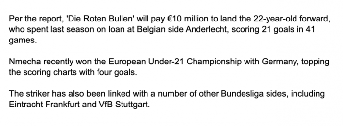 Alman medyası, Leipzig Kulübü'nün, Manchester City U23 takımında oynayan lucas Nmeche'yi transfer etmek için girişimleri hızlandırdığını yazdı. Yapılan haberlerde Lepipzig'in Lucas Nmeche için City'ye 10 milyon Euro teklif ettiğini, İngiliz ekibinin de bu öneriye sıcak baktığı ifade edildi. Leipzig'in kadrosuna katmak istediği 22 yaşındaki Lucas Nimeche geride kalan sezonu kiralık olarak Anderletch'te geçirdi. Genç forvet, Belçika'da 21 gol 3 asistlik performansı ile dikkatleri üzerine çekmeyi başardı. Leipzig cephesinde bu gelişmeler yaşanırken Almanlar flaş bir iddiada daha bulundu.