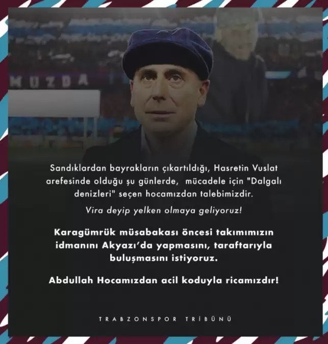 Trabzonspor taraftarlarının yaptığı ortak açıklamada ''Sandıklardan bayrakların çıkartıldığı, Hasretin Vuslat arefesinde olduğu şu günlerde, mücadele için ''Dalgalı denizleri'' seçen hocamızdan talebimizdir. Vira deyip yelken olmaya geliyoruz! Karagümrük müsabakası öncesi takımımızın idmanını Akyazı'da yapmasını, taraftarlarıyla buluşmasını istiyoruz. Abdullah Hocamızdan acil koduya ricamızdır. " ifadelerine yer verildi.