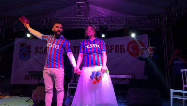 Artvin'in Kemalpaşa ilçesinde 6 yıl önce nişanlanan ve evlenmek için kendilerine Trabzonspor'un şampiyonluğunu şart koşan Tansu (28) ile Ali Tatar (32) önceki akşam Artvin Trabzonspor Taraftarlar Derneği'nin organize ettiği kutlamalar sırasında dünyaevine girdi... Fanatik Trabzonspor taraftarı olan çift valilik önündeki nikahın ardından bordo-mavi forma giyip, taraftarlara slogan attırdı.